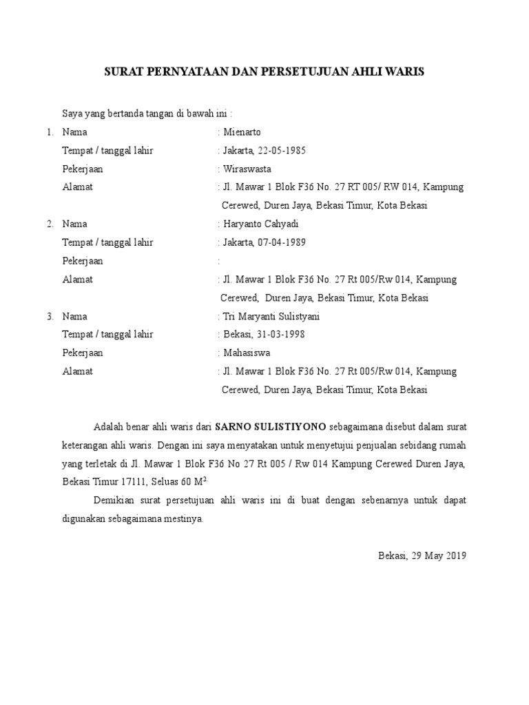 Surat ahli waris adalah sebuah surat yang mana menerangkan bahwa seseorang tersebut benar ahli waris. Contoh Surat Persetujuan Ahli Waris Menjual Tanah - 2 - Hak atas harta waris tidak terbatas pada hak atas bidang tanah. Surat ini dibutuhkan agar pernikahan Anda nantinya legal dan masuk catatan sipil.