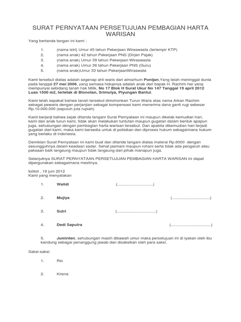 0 penilaian 0 menganggap dokumen ini bermanfaat 0 suara 112 tayangan 2 halaman. SURAT PERNYATAAN PERSETUJUAN PEMBAGIAN HARTA WARISAN. June 28 2020 by Nurul Saputro.